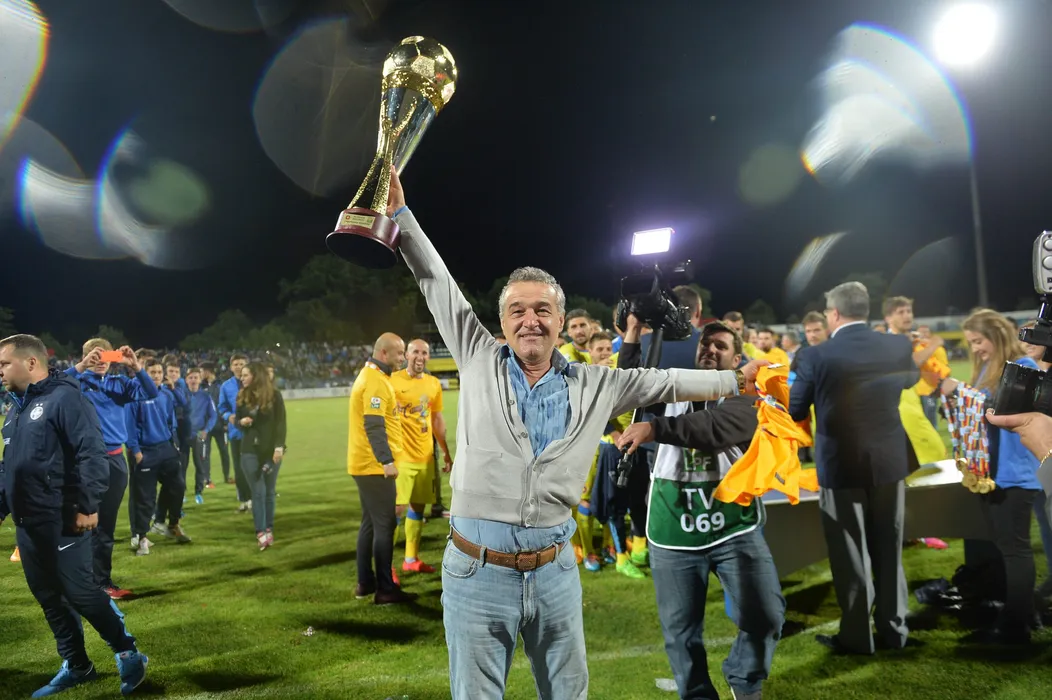 George Becali, finantatorul echipei Steaua, tine cupa castigata in finalul meciului cu CSMS Iasi, din cadrul etapei a XXXIV-a a Ligii I, la Iasi, joi, 28 mai 2015. Echipa Steaua a câstigat campionatul României pentru a treia oara consecutiv si a 26-a oara în istoria sa, în urma remizei cu formatia CSMS Iasi, scor 0-0, si a esecului înregistrat de ASA Târgu Mures, scor 1-2, cu Otelul Galati, în ultima etapa a Ligii I. ALEXANDRU HOJDA / MEDIAFAX FOTO