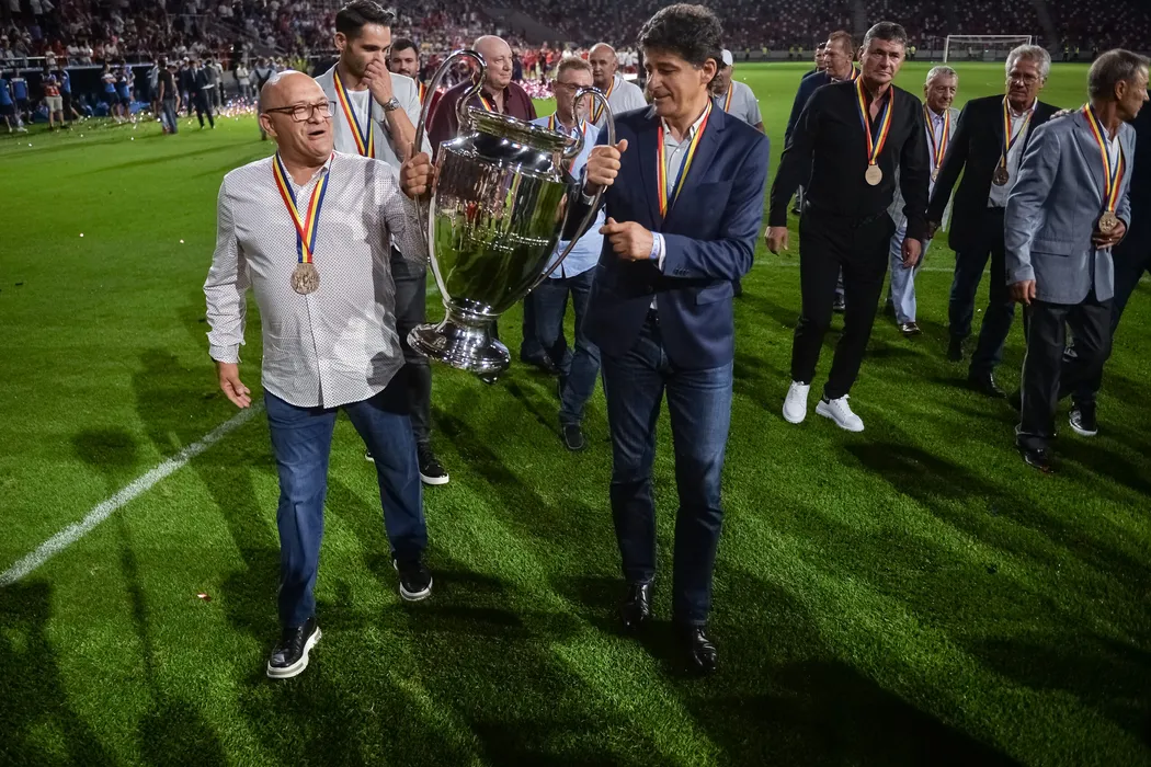 O replica a Cupei Campionilor Europeni a fost oferita jucatorilor care compuneau echipa Steaua in finala contra echipei Barcelonei din anul 1986, la finalul meciului amical contra OFK Belgrad, partida ce a marcat si inaugurarea noii arene din Ghencea, marti, 7 iulie 2021, in Bucuresti. ALEXANDRU DOBRE / MEDIAFAX FOTO