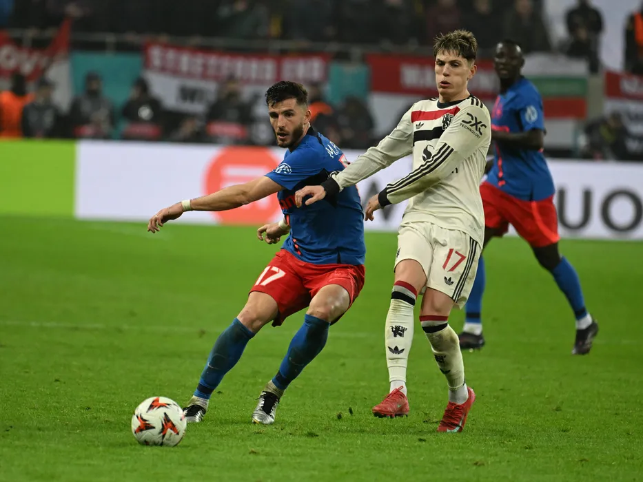 Mihai Popescu si Alejandro Garnacho in meciul de fotbal dintre FCSB si Manchester United, din cadrul UEFA Europa League, desfasurat pe Arena Nationala din Bucuresti, joi 30 ianuarie 2025. © FOTO:Razvan Pasarica/SPORT PICTURES
