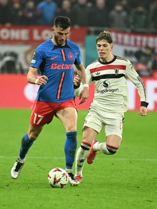 Mihai Popescu si Alejandro Garnacho in meciul de fotbal dintre FCSB si Manchester United, din cadrul UEFA Europa League, desfasurat pe Arena Nationala din Bucuresti, joi 30 ianuarie 2025. © FOTO:Razvan Pasarica/SPORT PICTURES
