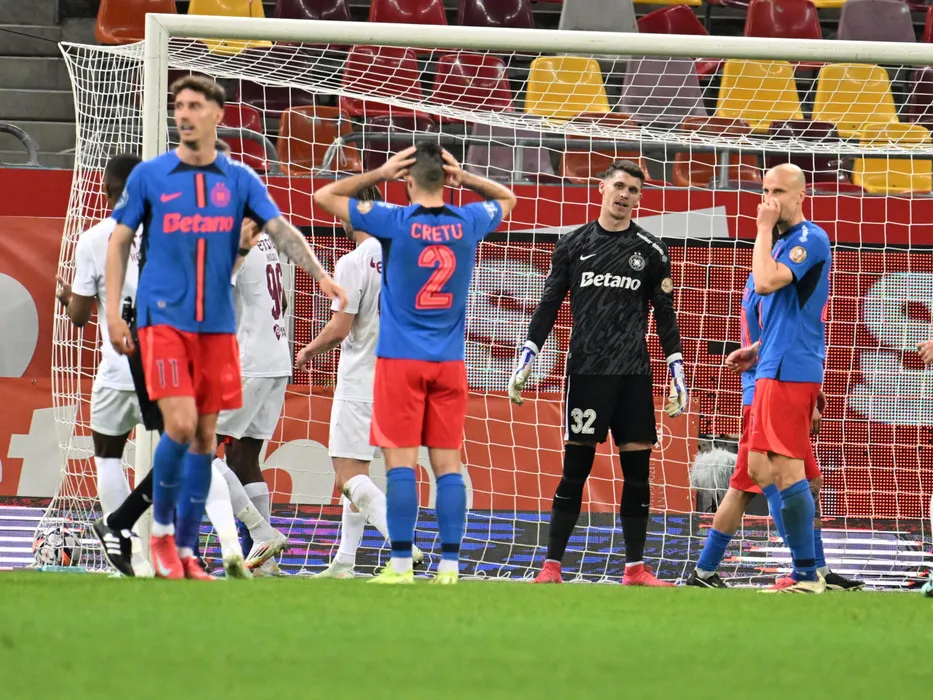 Ștefan Târnovanu si Vlad Iulian Chiricheș reacționează dupa un gol primit in meciul de fotbal dintre FCSB si CFR Cluj, din cadrul Play off-ului Superligii Superbet, desfasurat pe Arena Nationala din Bucuresti, duminica 20 aprilie 2025. © FOTO:Razvan Pasarica/SPORT PICTURES
