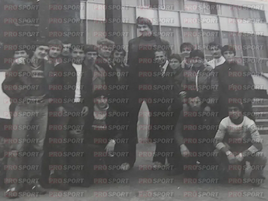 ”Pitici” în umbra uriașului Tkacenko: Hagi e pe rândul de sus, al treilea de la dreapta la stânga. În imagine mai apar, de la stânga – Meszaros (primul, cu mâinile în buzunar), Hâncu (al șaselea), Iașko (jos, în fața lui Hâncu), de la dreapta – Văsâi (în spatele lui Hagi), Varga (în fața lui Hagi)