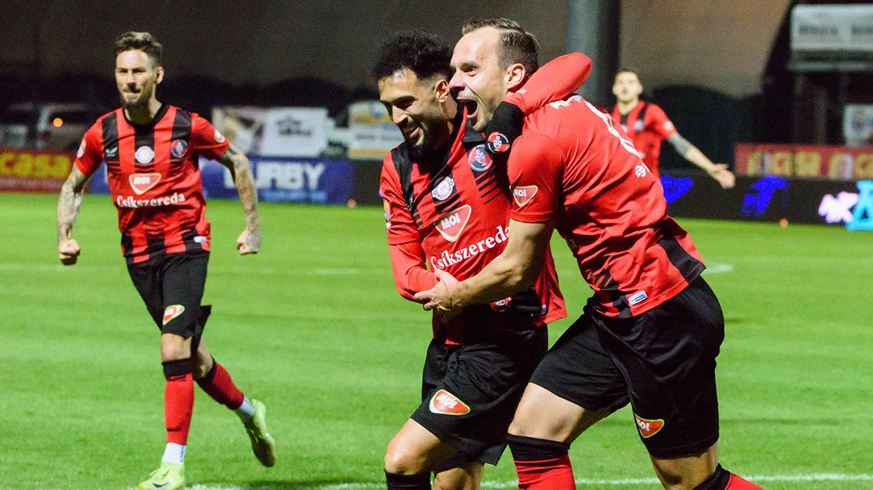 Soufiane Jebari si Dolný Jozef se bucura dupa un gol marcat in meciul de fotbal dintre AFK Csikszereda Miercurea Ciuc si FC Voluntari, contand pentru Liga 2 Casa Pariurilor - Play-Off Promovare, desfasurat pe Stadionul Municipal din Miercurea Ciuc, joi 27 martie 2025. © FOTO: Zoltan Pal/SPORT PICTURES