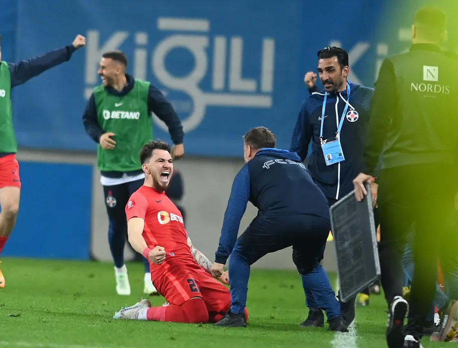 Deian Cristian Sorescu se bucura dupa un gol marcat alaturi de Eduard Gabriel Radaslavescu si Elias Charalambous in meciul de fotbal dintre Universitatea Craiova si FCSB, contand pentru Play-off-ul Superligii Superbet, desfasurat pe Stadionul Ion Oblemenco din Craiova, duminica 30 aprilie 2023. © FOTO:Razvan Pasarica/SPORT PICTURES