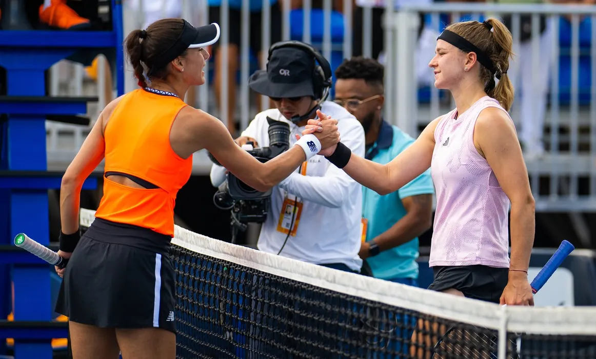 March 26, 2023, MIAMI, UNITED STATES: Sorana Cirstea of Romania & Karolina Muchova of the Czech Republic in action during the third round of the 2023 Miami Open WTA 1000 tennis tournament,Image: 765547919, License: Rights-managed, Restrictions: , Model Release: no