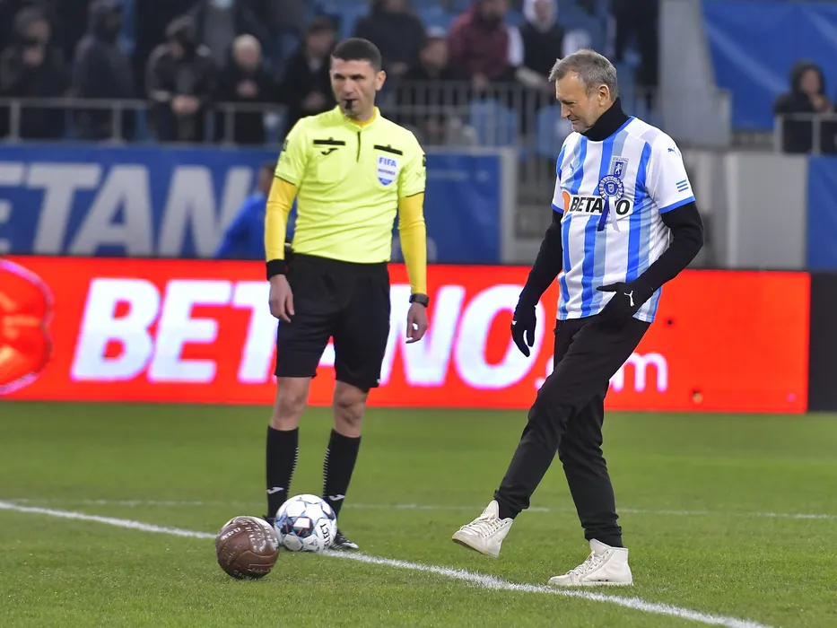Gica Craioveanu da lovitura de start la meciul de fotbal dintre Universitatea Craiova si FC U Craiova, contand pentru Liga 1 Casa Pariurilor, desfasurat pe Stadionul Ion Oblemenco din Craiova, luni 14 februarie 2022. © FOTO:Razvan Pasarica/SPORT PICTURES