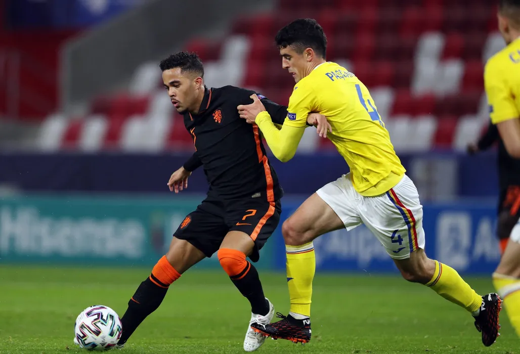 Netherland's Justin Kluivert (L) and Romania's Alexandru Pascanu vie for the ball during the UEFA Under21 Championship group stage football match Romania v the Netherlands at the Bozsik Arena in Budapest on March 24, 2021.,Image: 600975258, License: Rights-managed, Restrictions: , Model Release: no