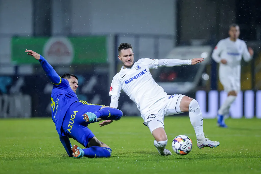 Roberto Carlo Casap și Ionuț Viorel Coadă în meciul de fotbal dintre AFC Unirea 04 Slobozia și FC Farul Constanța, contând pentru Superliga Superbet, desfășurat pe Stadionul din Clinceni, duminică 10 noiembrie 2024. © FOTO: Mihai-Antonio VASILE/SPORT PICTURES