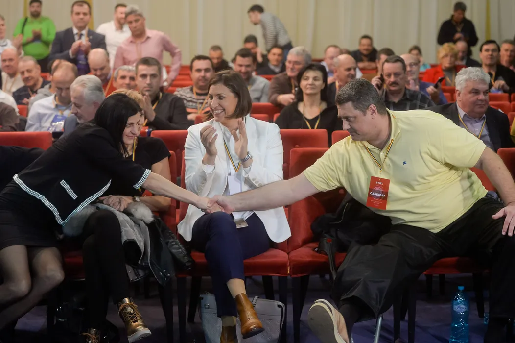Cei doi candidati la presedintia Federatiei Romane de Handbal (FRH), Narcisa Lecusanu si Alexandru Dedu, isi strang mainile, la finalul scrutinului desfasurat la sediul federatiei, miercuri 18 februarie 2017, in Bucuresti. Alexandru Dedu a fost reales cu 100 de voturi, iar Lecusanu a primit 99. ALEXANDRU DOBRE / MEDIAFAX FOTO