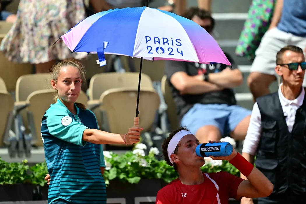 Norway's Casper Ruud takes a drink as he is sheltered from the sun while taking a break playing Japan's Taro Daniel during their men's singles first round tennis match on Court Suzanne-Lenglen at the Roland-Garros Stadium at the Paris 2024 Olympic Games, in Paris on July 28, 2024.,Image: 893349312, License: Rights-managed, Restrictions: , Model Release: no