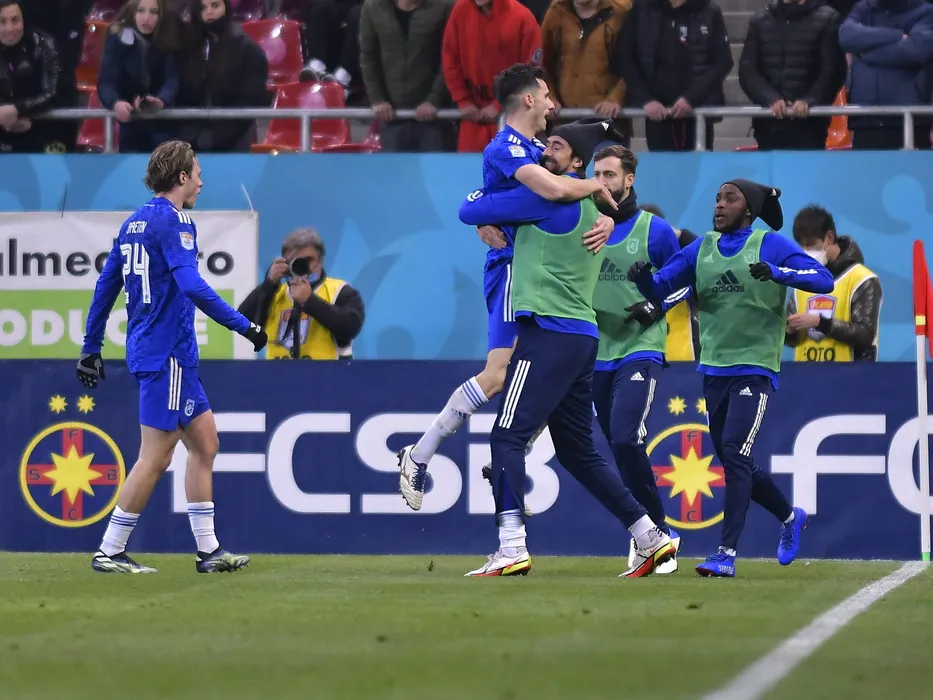 Claudiu Cristian Balan se bucura dupa un gol marcat alaturi de fotbalistii craioveni in meciul de fotbal dintre FCSB si FC U Craiova, contand pentru Liga 1 Casa Pariurilor, desfasurat pe Arena Nationala din Bucuresti, duminica 6 februarie 2022. © FOTO:Razvan Pasarica/SPORT PICTURES