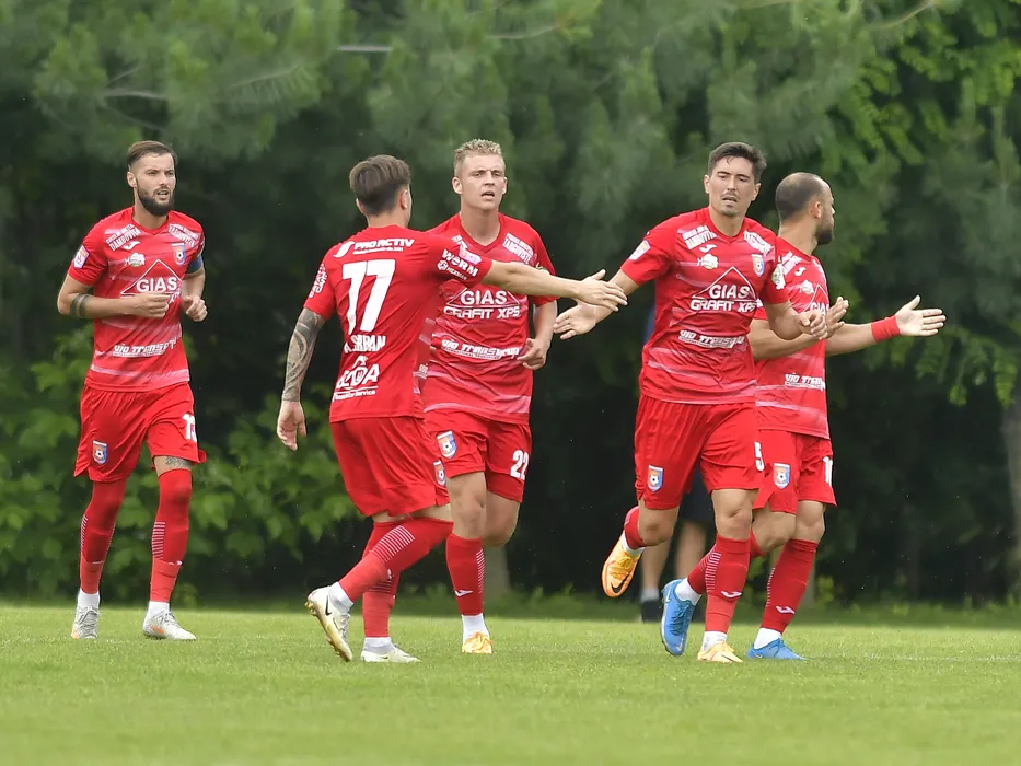 Bucurie a fotbalistilor targovisteni dupa un gol marcat cu George Cristian Cherchez, Constantin Dima, Daniel Marinel Celea si Cristian Negut in meciul amical de fotbal dintre Farul Constanta si Chindia Targoviste, desfasurat la Baza Campo Verde din Ghimbav, sambata 2 iulie 2022. © FOTO:Razvan Pasarica/SPORT PICTURES