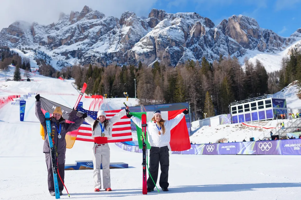 08 February 2026, Italy, Cortina d'Ampezzo: (L-R) Germany's silver-medallist Emma Aicher, US' gold-medallist Breezy Johnson and Italy's bronze-medallist Sofia Goggia celebrate after the Women's Downhill Alpine Skiing competition during the 2026 Winter Olympic Games Milan-Cortina. Photo: Michael Kappeler/dpa