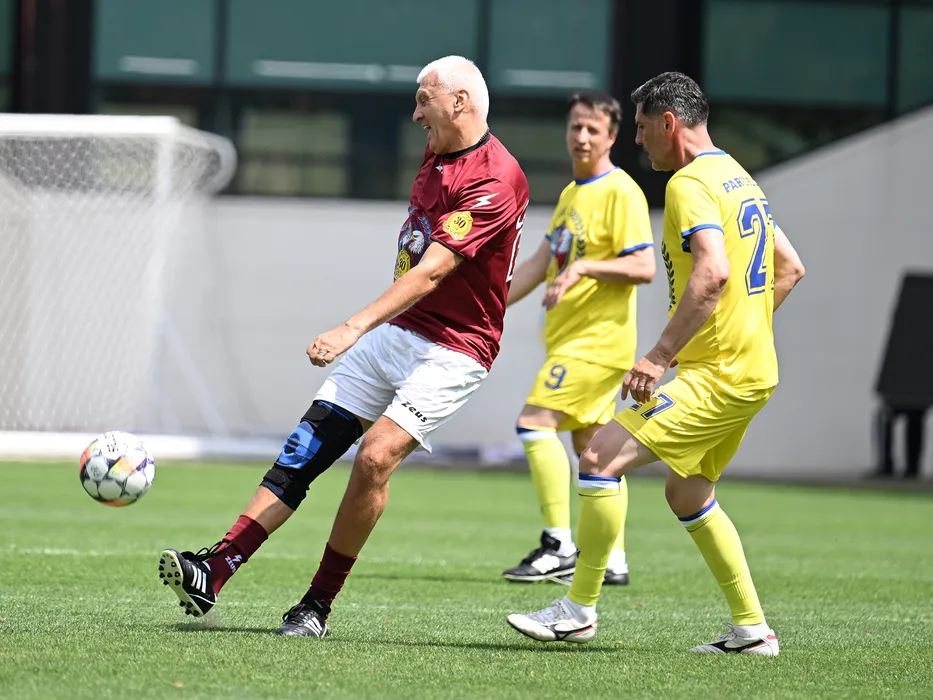 Florin Motroc si Florin Pirvu in meciul amical de fotbal old boys dintre Petrolul Ploiesti si Rapid Bucuresti, reeditarea finalei Cupei Romaniei, editia 1995, desfasurat pe stadionul Ilie Oana din Ploiesti, sambata 21 iunie 2025. © FOTO:Razvan Pasarica/SPORT PICTURES