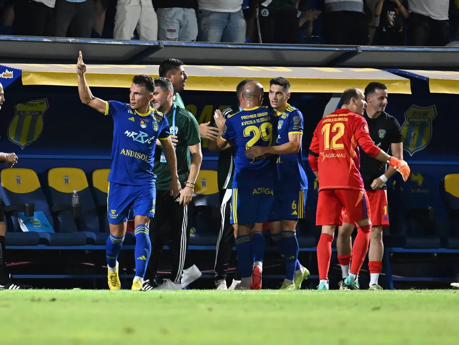 Filip Mihai Ilie se bucură dupa un gol marcat alături de Daniel Marius Serbanica si Marius Paul Antoche in meciul dintre Unirea Slobozia si FCSB, contand pentru Superliga Superbet, desfasurat pe Clinceni Arena din Clinceni, vineri 19 iulie 2024. © FOTO:Razvan Pasarica/SPORT PICTURES