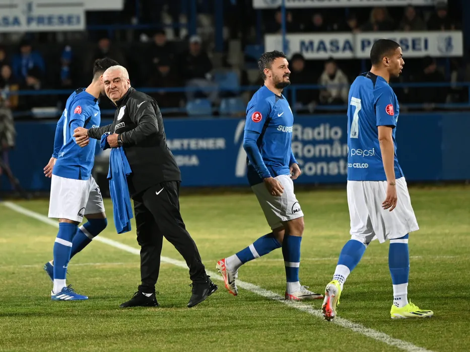 Vasile Manaila da lovitura de start alături de Constantin Valentin Budescu si Rivaldinho (Mosca Rivaldo Vitor Ferreira) în meciul de fotbal dintre Farul Constanta si Dinamo Bucuresti, contând pentru Superliga Superbet, desfășurat pe Stadionul central al Academiei Gheorghe Hagi din Ovidiu, luni 12 februarie 2024. © FOTO: Răzvan PĂSĂRICĂ/SPORT PICTURES