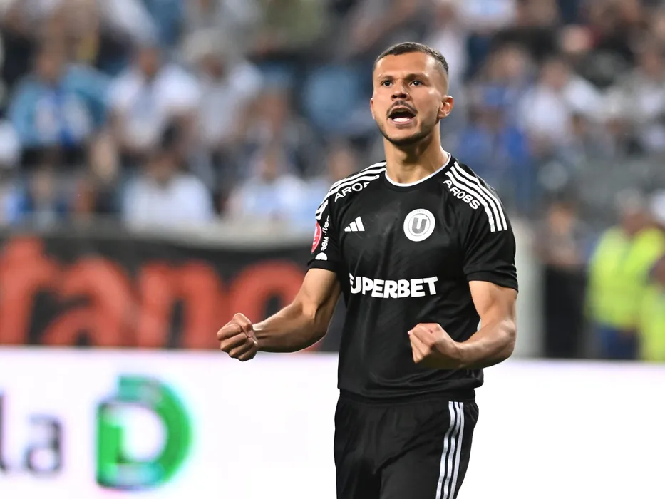 Thalisson Kelven Da Silva se bucura dupa marcarea unui gol din penalty la meciul de fotbal dintre Universitatea Craiova si Universitatea Cluj, barajul pentru calificarea in preliminariile Conference League, desfășurat pe Stadionul Ion Oblemenco din Craiova, duminica 26 mai 2024. © FOTO: Răzvan PĂSĂRICĂ/SPORT PICTURES