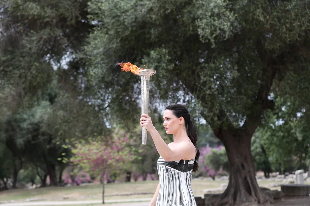 ANCIENT OLYMPIA, April 16, 2024 -- Greek actress Mary Mina, in the role of High Priestess, holds the torch during the Olympic flame lighting ceremony for the Paris 2024 Summer Olympic Games in Ancient Olympia, Greece, on April 16, 2024.,Image: 865307102, License: Rights-managed, Restrictions: , Model Release: no