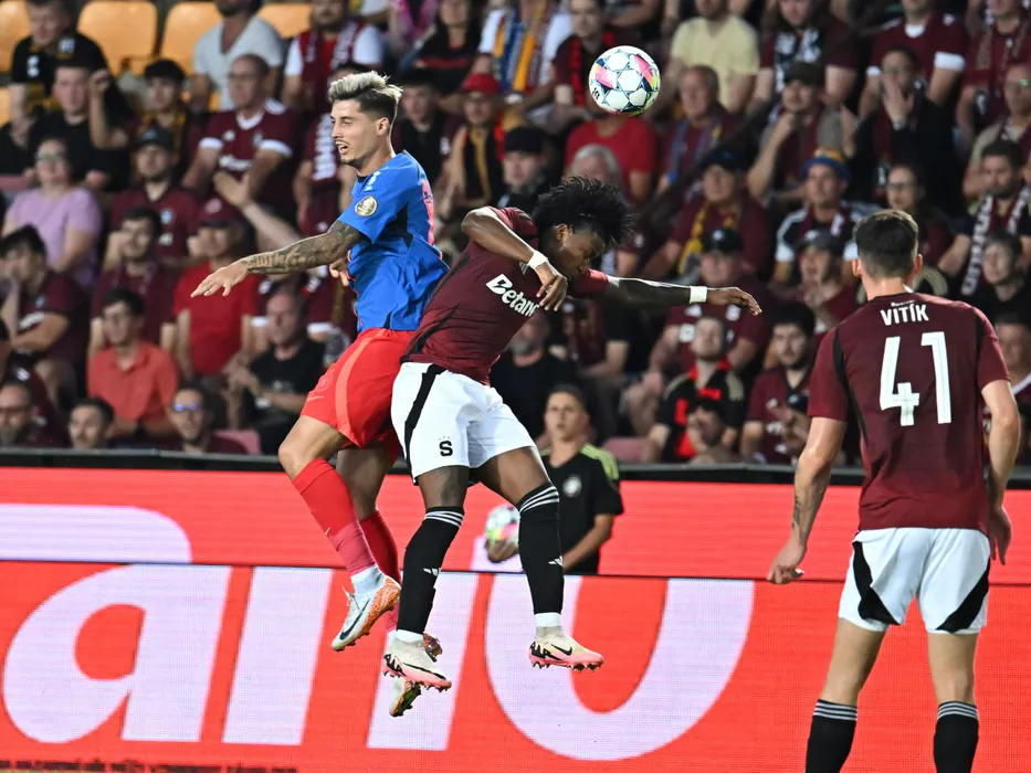 David Raul Miculescu si Angelo Preciado in meciul dintre Sparta Praga si FCSB, contand pentru Preliminariile Ligii Campionilor, desfasurat pe Stadionul Letna din Praga, marti 6 august 2024. © FOTO:Razvan Pasarica/SPORT PICTURES