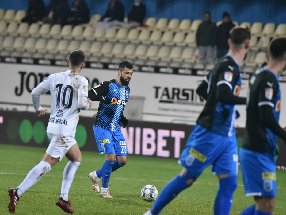 Marius Marcel Constantin si Ronaldo Deaconu in meciul de fotbal dintre Gaz Metan Medias si Universitatea Craiova, contand pentru Liga 1 Casa Pariurilor, desfasurat pe Stadionul Municipal din Medias, sambata 18 decembrie 2021. © FOTO:Alex Veres/SPORT PICTURES