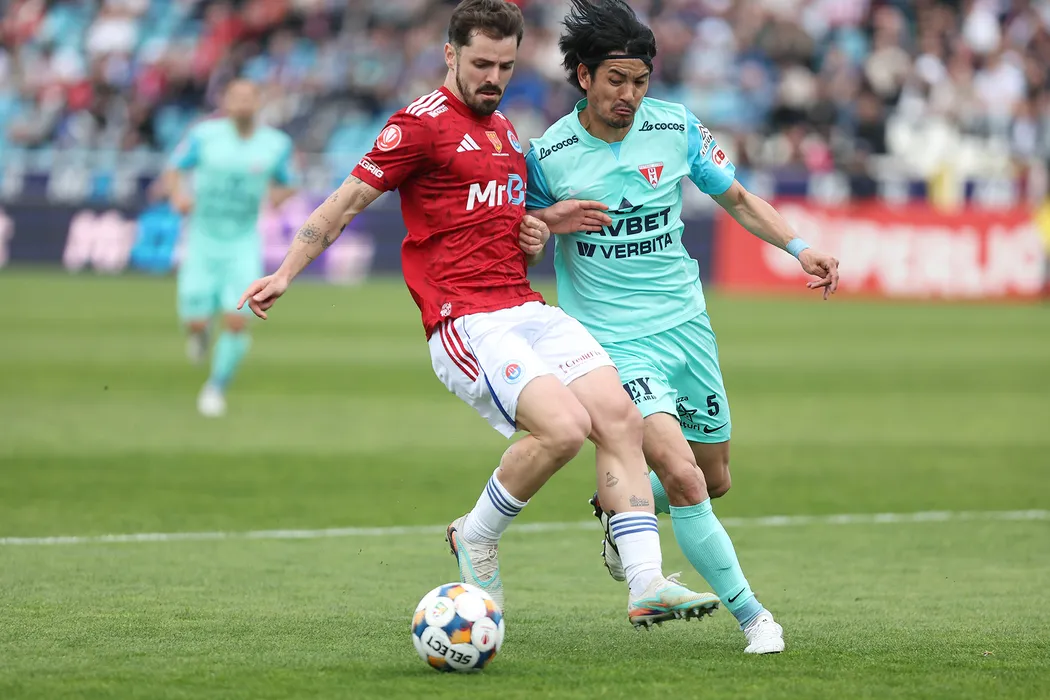 Joao Pedro Santos Lameira si Sota Mino in meciul de fotbal dintre SC Otelul Galati si UTA Arad, contand pentru Superliga Superbet Play-Out, desfasurat pe Stadionul Otelul din Galati, vineri 17 aprilie 2026. © FOTO:Sorin Pana/SPORT PICTURES