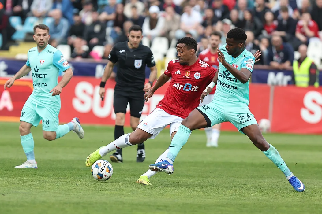 Alin Roman, Fernandes Fabio Patrick Dos Reis Dos Santos si Florent Gregoire Paulolo in meciul de fotbal dintre SC Otelul Galati si UTA Arad, contand pentru Superliga Superbet Play-Out, desfasurat pe Stadionul Otelul din Galati, vineri 17 aprilie 2026. © FOTO:Sorin Pana/SPORT PICTURES