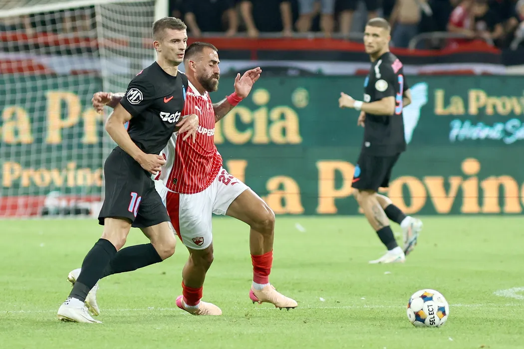 Maxime Sivis (D), de la Dinamo, lupta pentru balon cu Florin Tanase (S), de la FCSB, in timpul meciului de fotbal din etapa a IV-a a Superligii, disputat pe Arena Nationala din Bucuresti, sambata, 2 august 2025. GEORGE FLUSTER / MEDIAFAX FOTO