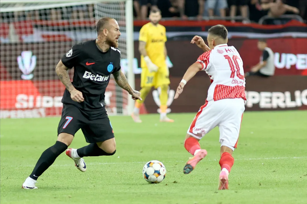 Catalin Cirjan (D), de la Dinamo, lupta pentru balon cu Denis Alibec (S), de la FCSB, in timpul meciului de fotbal din etapa a IV-a a Superligii, disputat pe Arena Nationala din Bucuresti, sambata, 2 august 2025. GEORGE FLUSTER / MEDIAFAX FOTO