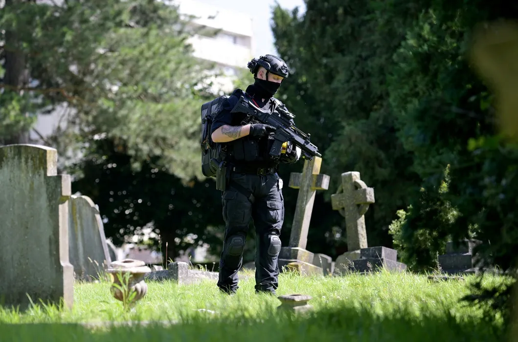 Armed police search Lavender Hill Cemetery in Enfield, as the hunt Kyle Clifford (26), the suspect in a triple murder case continues. July 10, 2024. Release date � July 10, 2024. Detectives investigating a triple murder which occurred in Bushey, Hertfordshire, yesterday evening (Tuesday 9 July) are actively seeking a man who is wanted in connection with the incident. Police were called to a property in Ashlyn Close just before 7pm. Officers attended alongside the ambulance service and on arrival, found three women with serious injuries. Sadly, despite their best efforts, the women, who are believed to be related, died a short time later at the scene. Police have since been searching throughout the night for 26-year-old Kyle Clifford from the Enfield area who is wanted in connection with the incident.,Image: 888903011, License: Rights-managed, Restrictions: Editorial use, commercial use may require additional licenses. We don't use AI to make images which could be mistaken for news photos. AI use will be clearly indicated. Supplied on condition you ensure personal data is processed in compliance with DPA2018, Model Release: no