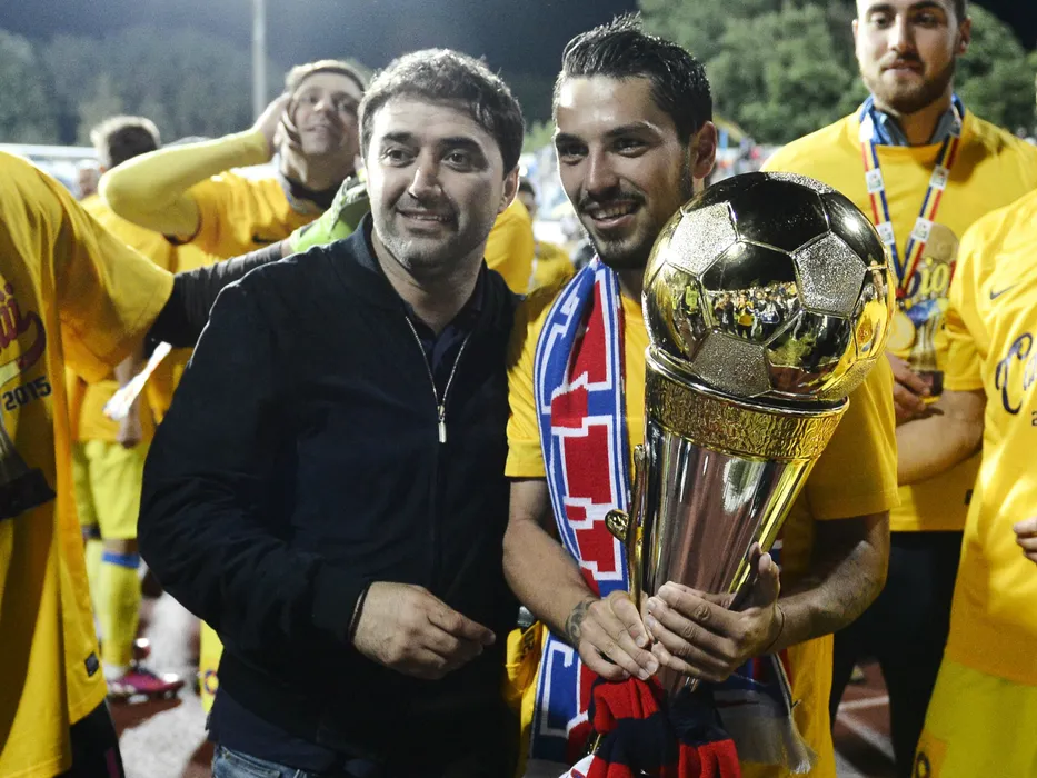 Ionut Lutu si Nicusor Stanciu pozeaza alaturi de trofeul acordat castigatoarei ligii 1