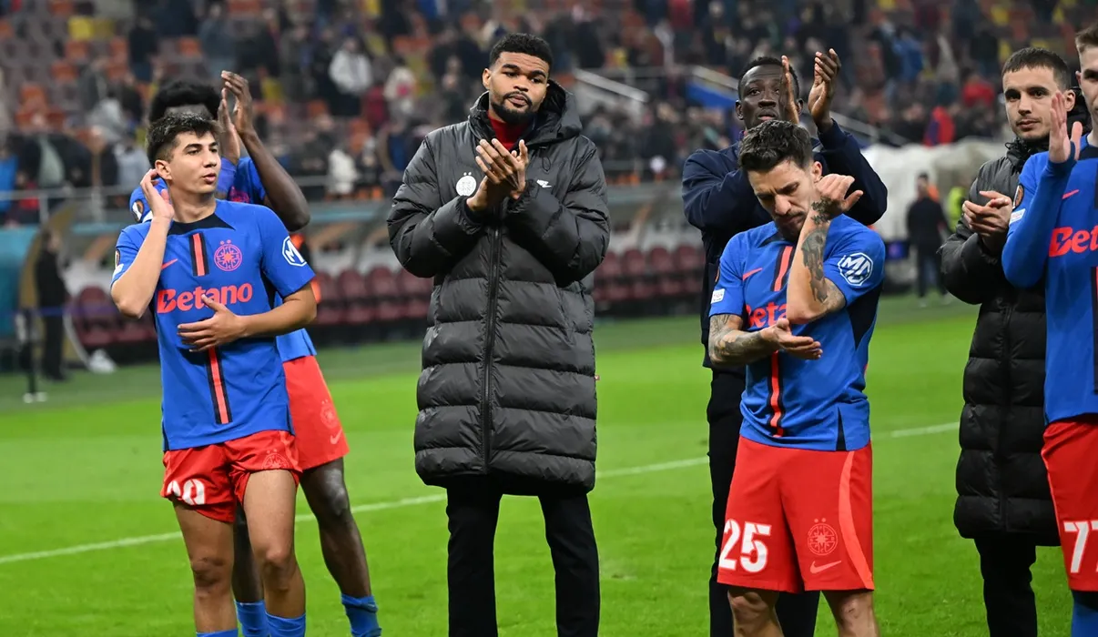 Fotbaliștii ros-albastrii Alexandru Marian Musi, Malcolm Sylas Laouari Edjouma, Baba Alhassan, Alexandru Mihail Baluță si Juri Cisotti salută galeria după meciul de fotbal dintre FCSB si Olympique Lyon, din cadrul UEFA Europa League, desfasurat pe Arena Nationala din Bucuresti, joi 6 martie 2025. © FOTO:Razvan Pasarica/SPORT PICTURES