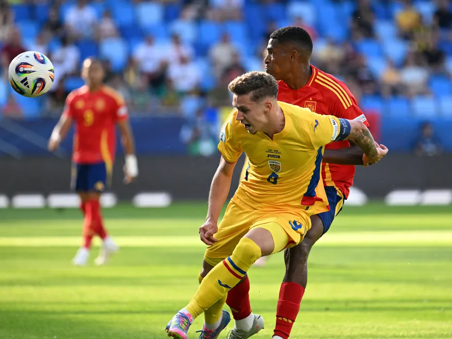 Louis Munteanu si Cristian Mosquera in meciul de fotbal dintre Spania U21 si Romania U21, din cadrul UEFA EURO U21 din Slovacia, desfasurat pe Stadionul National de fotbal din Bratislava, sambata 14 iunie 2025. © FOTO:Razvan Pasarica/SPORT PICTURES