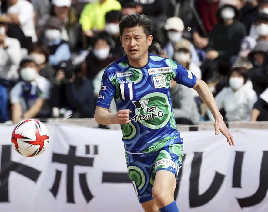 FILE: Kazuyoshi Miura, Japanese footballer who belongs to Suzuka Point Getters of Japan Football League (JFL), takes part in the JFL match against Aomori at Yokkaichi City Chuo Ryokuchi Field in Yokkaichi, Mie Prefecture on March 13, 2022. Miura announced that he will transfer to Liga Portugal 2 União Desportiva Oliveirense (UDO) with a limited term. The transfer period is until this summer, and the uniform number is scheduled to be "11". 55-year-old King Kazu played for the Japan national team from 1990 to 2000, and holds the records for being the oldest goal scorer in the J-League, the footballer with the world's longest professional career, and, as of 2022, is the oldest professional footballer in the world at 55.,Image: 753589511, License: Rights-managed, Restrictions: This content is intended for editorial use only. For other uses, additional clearances may be required.
