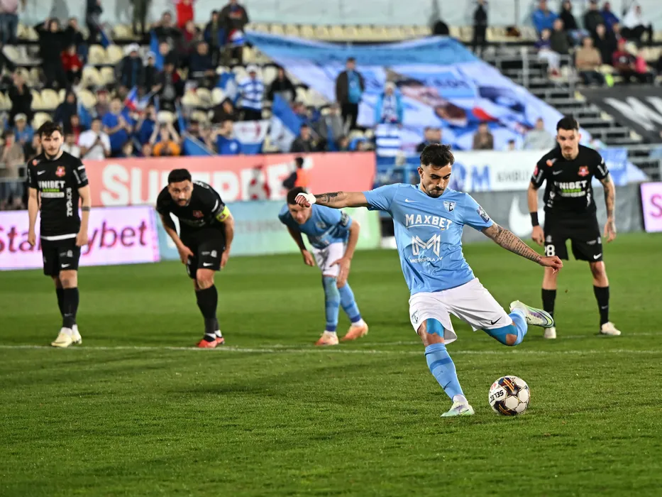 George Cristian Merloi marcheaza un gol din penalty în meciul de fotbal dintre FC Voluntari si FC Hermannstadt, contând pentru Play-out-ul Superligii Superbet, desfășurat pe Stadionul Anghel Iordanescu din Voluntari, vineri 29 martie 2024. © FOTO: Răzvan PĂSĂRICĂ/SPORT PICTURES