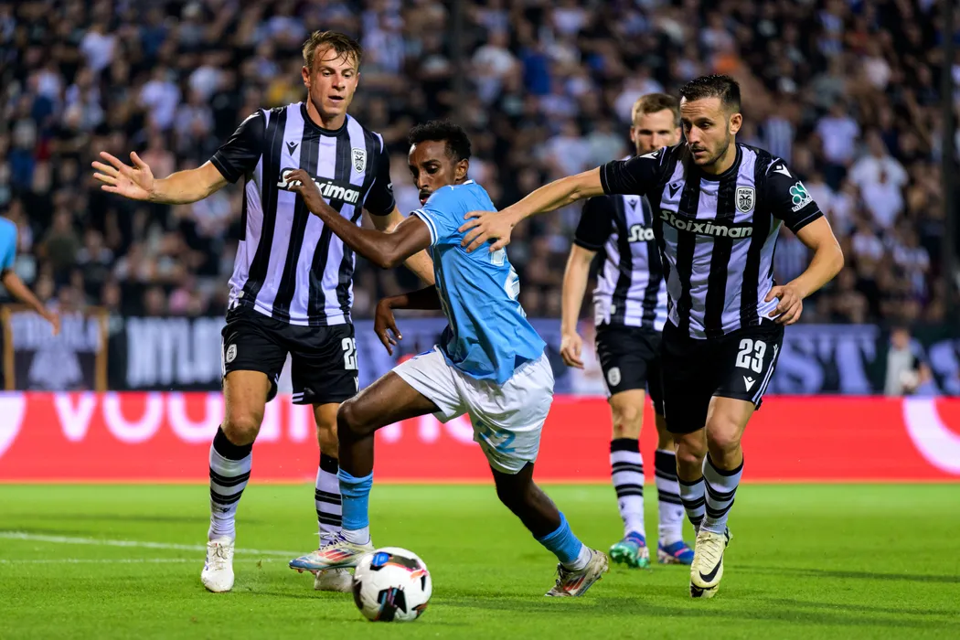 August 13, 2024, Thessaloniki, Greece: 240813 Taha Ali of Malmö FF and Joan Sastre of PAOK during the UEFA Champions League football match between PAOK and Malmo FF on August 13, 2024 in Thessaloniki. .Photo: Mathilda Ahlberg / BILDBYRÃ