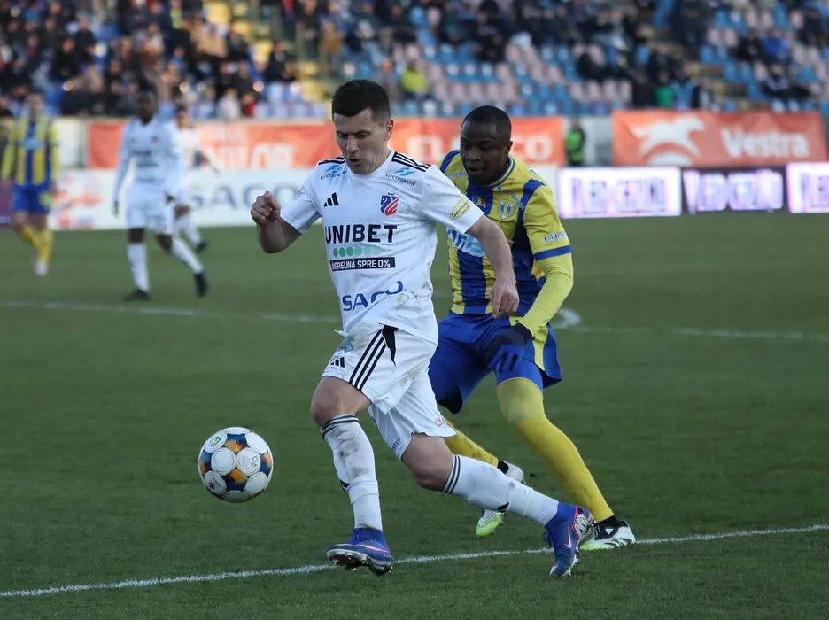 Mihai Catalin Bordeianu si Danel Jordan Dongmo in meciul de fotbal dintre FC Botosani si FC Petrolul Ploiesti, contand pentru Superliga Superbet, desfasurat pe Stadionul Municipal din Botosani, sambata 7 martie 2026. © FOTO:Ionut Tabultoc/SPORT PICTURES