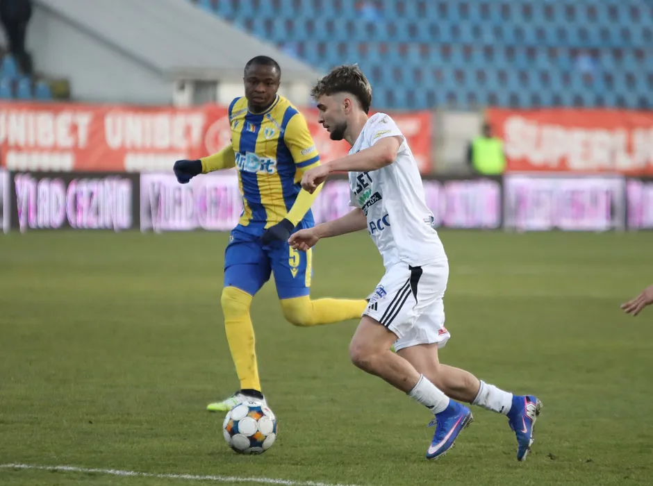 Zoran Mitrov si Danel Jordan Dongmo in meciul de fotbal dintre FC Botosani si FC Petrolul Ploiesti, contand pentru Superliga Superbet, desfasurat pe Stadionul Municipal din Botosani, sambata 7 martie 2026. © FOTO:Ionut Tabultoc/SPORT PICTURES