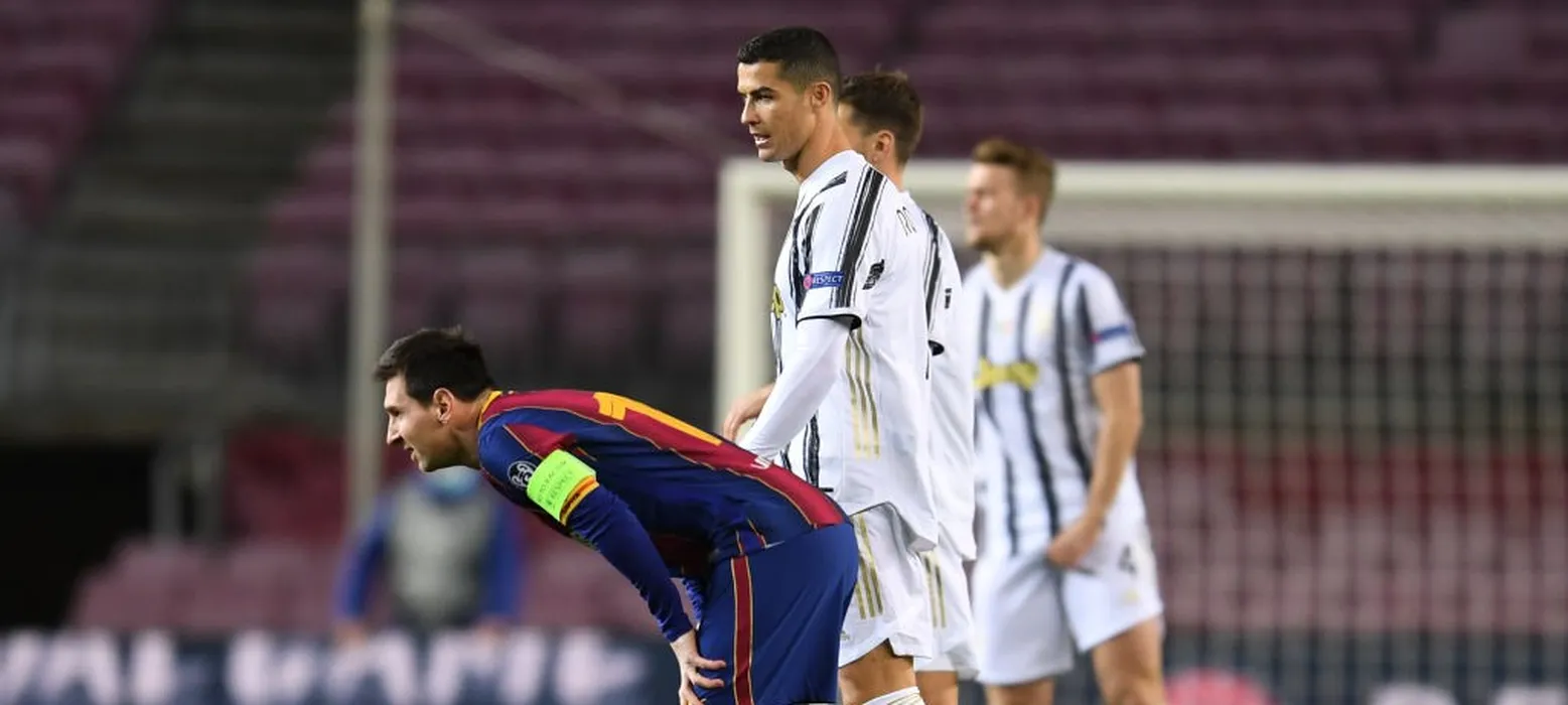 BARCELONA, SPAIN - DECEMBER 08: Lionel Messi of Barcelona and Cristiano Ronaldo of Juventus F.C. talk during the UEFA Champions League Group G stage match between FC Barcelona and Juventus at Camp Nou on December 08, 2020 in Barcelona, Spain. Sporting stadiums around Spain remain under strict restrictions due to the Coronavirus Pandemic as Government social distancing laws prohibit fans inside venues resulting in games being played behind closed doors. (Photo by David Ramos/Getty Images)