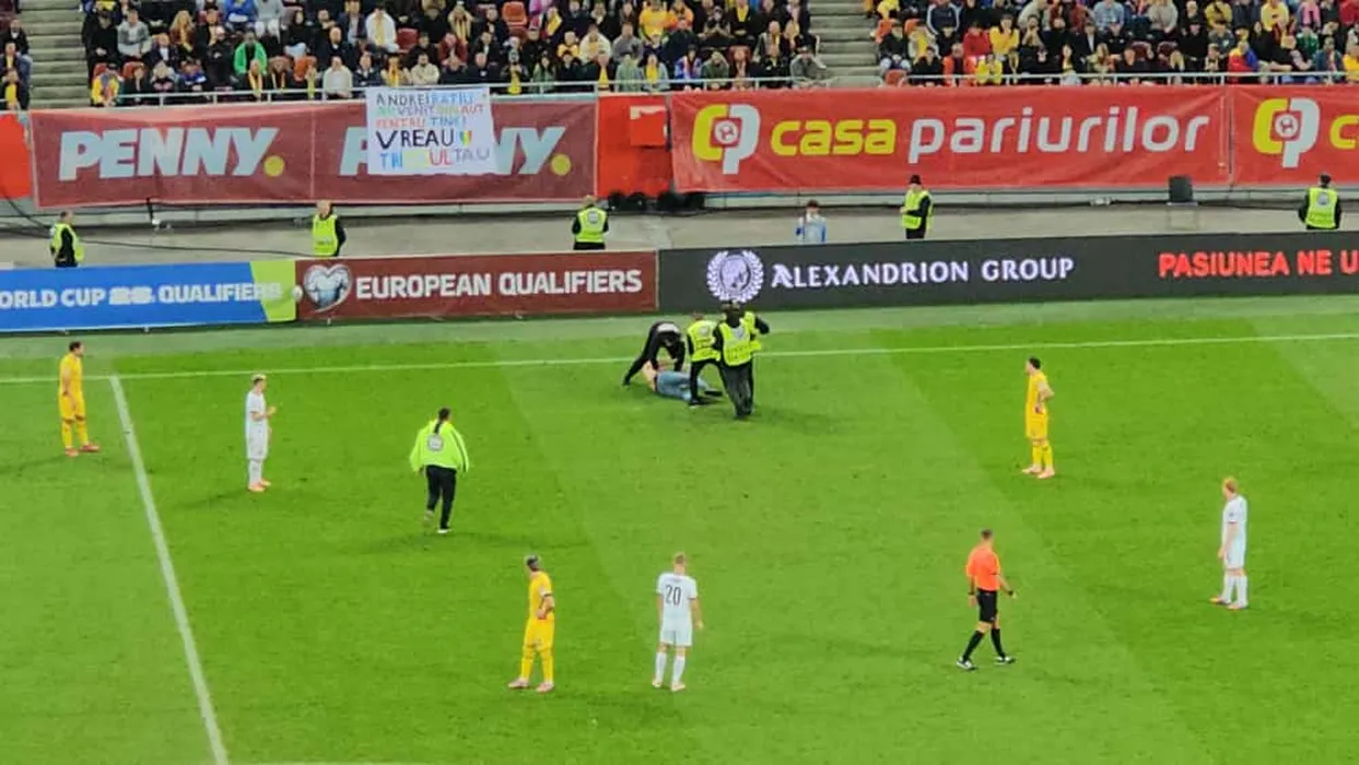 A intrat la bustul gol pe teren în România – Austria. Stewarzii au intervenit și au reușit placarea sa după câteva zeci de secunde