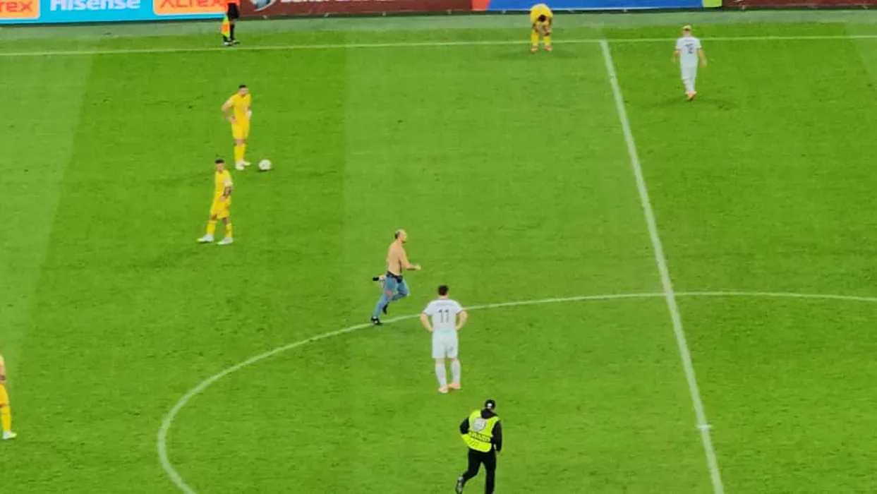 A intrat la bustul gol pe teren în România – Austria. Stewarzii au intervenit și au reușit placarea sa după câteva zeci de secunde