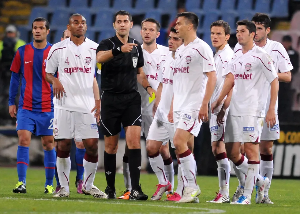 Arbitrul central Robert Dumitru din Brasov ii arata lui Daniel Pancu un cartonas galben sub privirile lui Geraldo Alves,Marcos Antonio,Vladimir Bozovic,Costin Lazar si Ovidiu Herea.