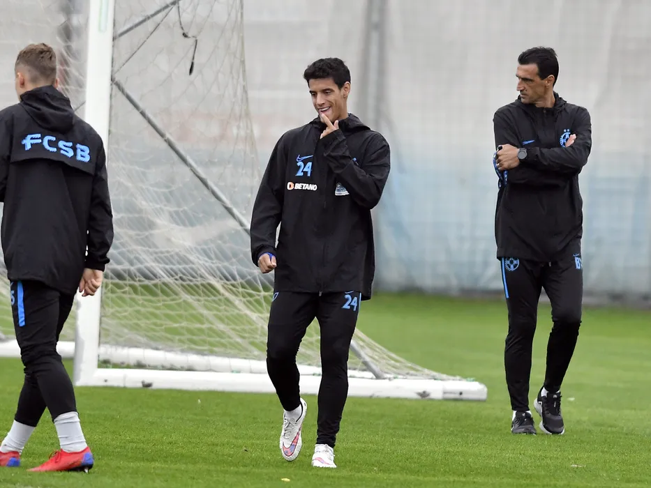 Fotbalistul de la FCSB Diogo Salomao alaturi de antrenorul Bogdan Arges Vintila la antrenamentul de dinaintea meciului cu Dinamo Bucuresti, din cadrul Ligii 1 Casa Pariurilor, desfasurat la Baza de antrenament FCSB din Berceni, vineri 4 octombrie 2019. © FOTO:Razvan Pasarica/SPORT PICTURES