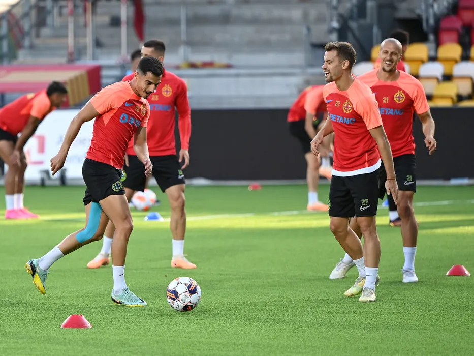 Fotbalistii de la FCSB Valentin Gheorghe, Vlad Iulian Chiriches si Darius Dumitru Olaru la antrenamentul oficial de dinaintea meciului impotriva lui FC Nordsjælland, din cadrul UEFA Europa Conference League, desfasurat pe Stadionul Right to Dream Park din Farum, miercuri 16 august 2023. © FOTO:Razvan Pasarica/SPORT PICTURES