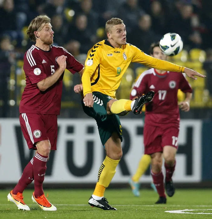 Lithuania's Deivydas Matulevicius, right, is challenged by Latvia's Artis Lazgins, left, during the World Cup group G qualifying soccer match between Lithuania and Latvia in Vilnius, Lithuania, Friday, Oct. 11, 2013.,Image: 589357539, License: Rights-managed, Restrictions: This content is intended for editorial use only. For other uses, additional clearances may be required., Model Release: no, Pictured: Deivydas Matulevicius; Artis Lazgins