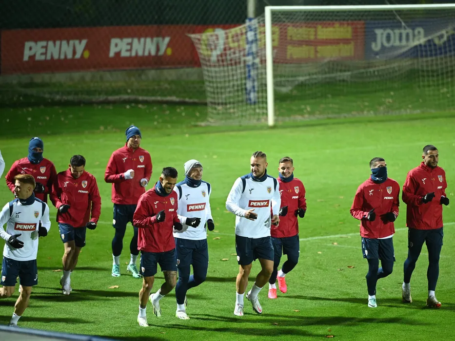 Fotbalistii romani Andres Dumitrescu, Florin Tanase, Olimpiu Morutan,Denis Alibec,Andrei Ratiu,George Puscas,Marius Stefanescu, Valentin Mihaila si Vladimir Screciu la antrenamentul oficial de dinaintea meciului impotriva Elvetiei, din cadrul preliminariilor Campionatului European 2024, desfasurat la Centrul National de Fotbal de la Mogosoaia, luni 20 noiembrie 2023. © FOTO:Razvan Pasarica/SPORT PICTURES