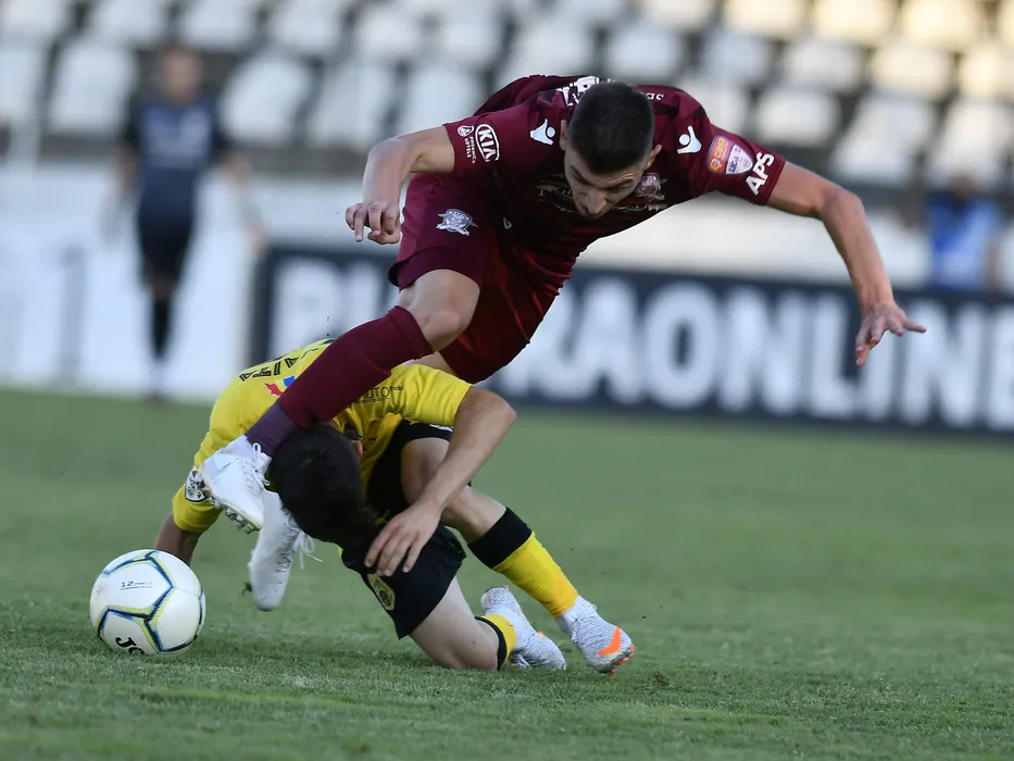 Alin Carstocea si Florian Haita in meciul de fotbal dintre Rapid Bucuresti si Turris Oltul Turnu Magurele, contand pentru play-off-ul de promovare al Ligii a-2-a Casa Pariurilor, desfasurat fara spectatori pe Stadionul Regie din Bucuresti, duminica 2 august 2020. © FOTO:Razvan Pasarica/SPORT PICTURES