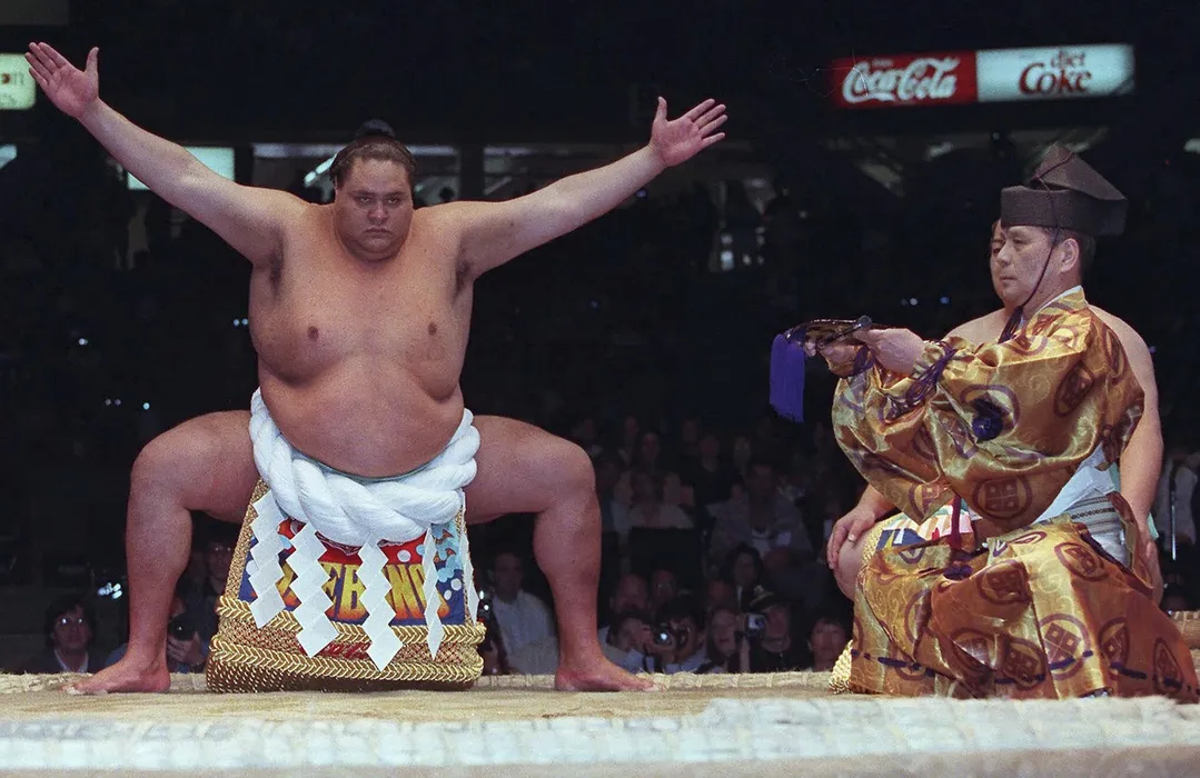 FILE - Hawaiian-born Taro Akebono, Japan's top Sumo wrestler, takes part in a ceremony in the ring prior to competition in Vancouver, British Columbia, on June 6, 1998. Hawaii-born Akebono, one of the greats of sumo wresting and a former grand champion, is reported to have died earlier this month of heart failure while receiving care at a hospital in Tokyo, the United States Forces in Japan said in a statement on Thursday, April 11, 2024.,Image: 863961470, License: Rights-managed, Restrictions: This content is intended for editorial use only. For other uses, additional clearances may be required.