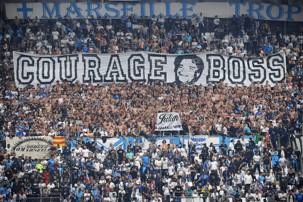 Marseille's fans display a banner in support of former Olympique Marseille's French president and businessman Bernard Tapie before the UEFA Europa League group E football match between Olympique de Marseille and Galatasaray AS at the Velodrome Stadium in Marseille, southern France on September 30, 2021.,Image: 635530906, License: Rights-managed, Restrictions: , Model Release: no, Credit line: Profimedia