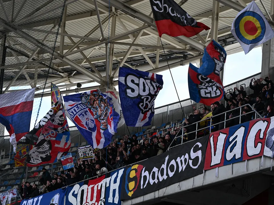 Galeria stelista Peluza Sud la meciul de fotbal dintre Steaua Bucuresti si FC Voluntari, contand pentru Play off-ul Ligii a-2-a Casa Pariurilor, desfasurat pe Stadionul Steaua-Ghencea din Bucuresti, miercuri 9 aprilie 2025. © FOTO:Razvan Pasarica/SPORT PICTURES