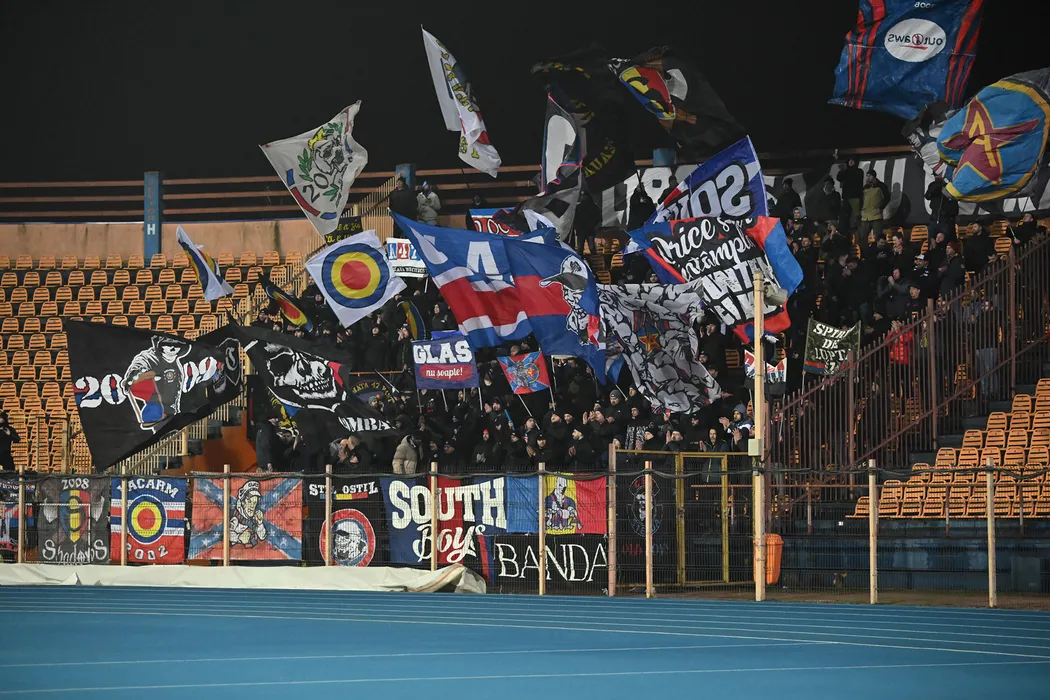 Galeria stelista cu steaguri si fulare isi incurajeaza favoritii in meciul de fotbal dintre ACSM Ceahlaul Piatra Neamt si Steaua Bucuresti, contand pentru Liga 2 Casa Pariurilor, desfasurat pe Stadionul Ceahlaul din Piatra Neamt, joi 27 februarie 2025. © FOTO: Tudy/SPORT PICTURES